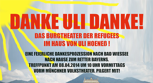 Thank you Uli Thank you! - Procession of Acceptance to the „Burgtheater of the Refugees“ in the house of the condemned tax evader Uli Hoeneß, „Radikal Jung Theaterfestival“ Munich, 2014. Together with Unkoordinierte Bewegung and the artspace „Lothringer13 Laden“.