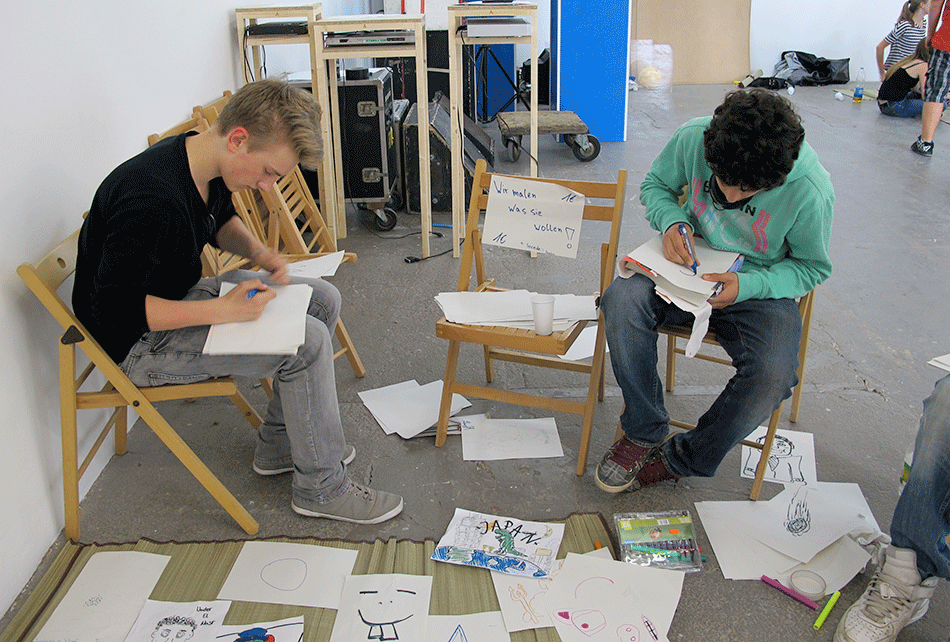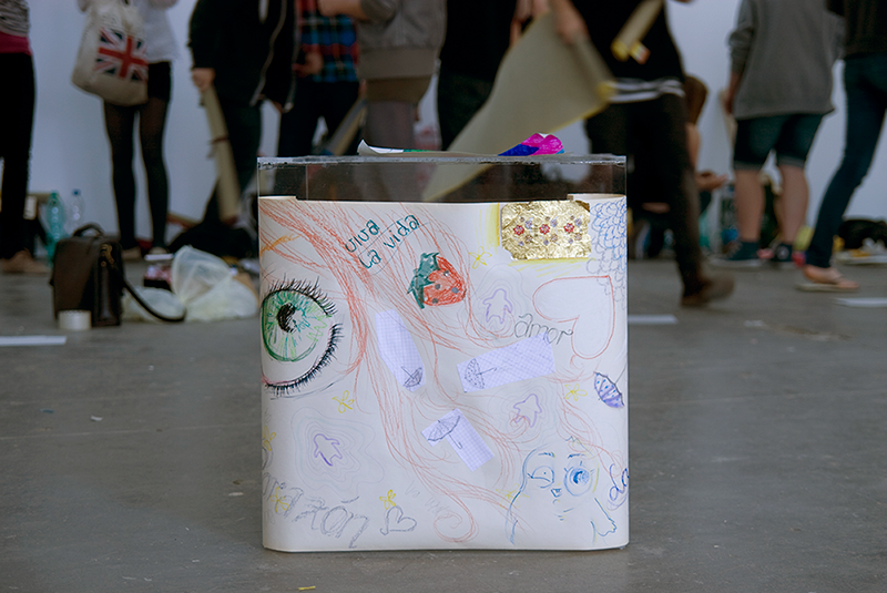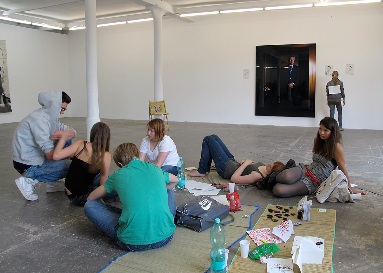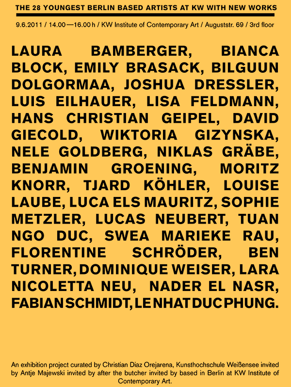 2009 Klaus Wowereit (mayor of Berlin) initiates a „efficiency show“ of young Berlin based artists. He is confronted with a harsh critique by a lot of artists who say that art is not there to be used as city marketing. Then the curators of the „efficiency show“ rename it to „Based in Berlin“. Then „Based in Berlin“ invites the a.o. Artspace „After the Butcher“ which then invites a.o. Antje Majewski which then invites a.o. Christian Diaz Orejarena which then invites THE YOUNGEST BERLIN BASED ARTISTS to the KW Institute for Contemporary Art to perform and sell their new works.
