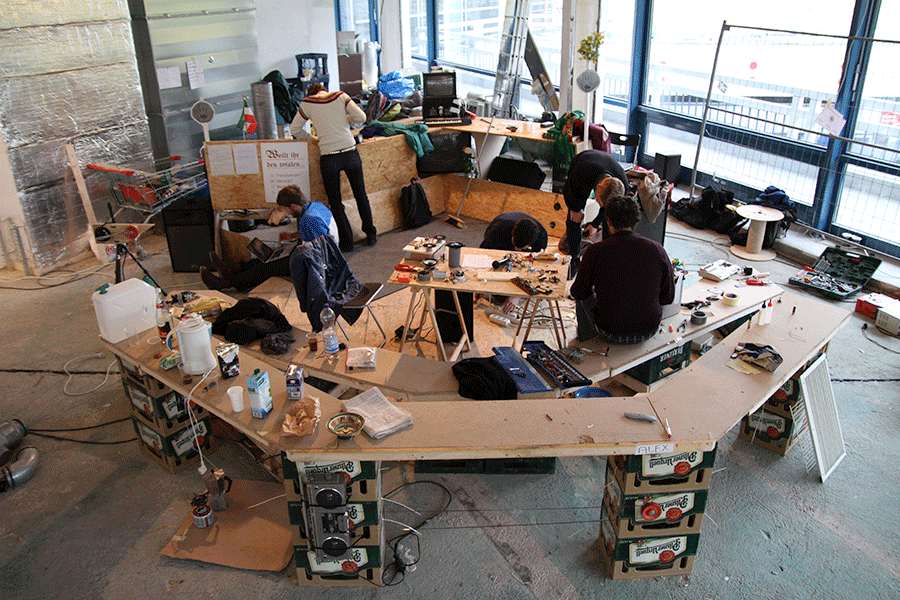 Ad-hoc and modular: A stage-structure and collectively put-on program in the tentacles of the Alexanderplatz-Tv-Tower-building in Berlin ran for 2 weeks. Works mediating MISSIONS and Guests conveying VISIONS. The program of workshops, concerts, lectures and screenings was put together by Sara Lehn and Christian Diaz Orejarena. With AKV Berlin publishers collective, Paula Bulling, Klaus Weber , Niklas Roy , The Parabelles and many more. M100 was docked onto hochher, exhibition of the students of the Kunsthochschule Weißensee Berlin, 2010.