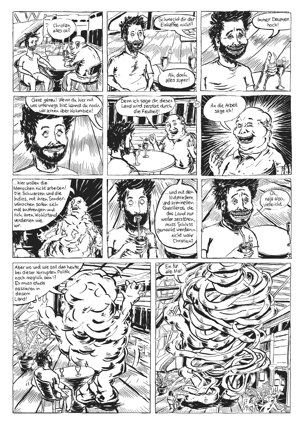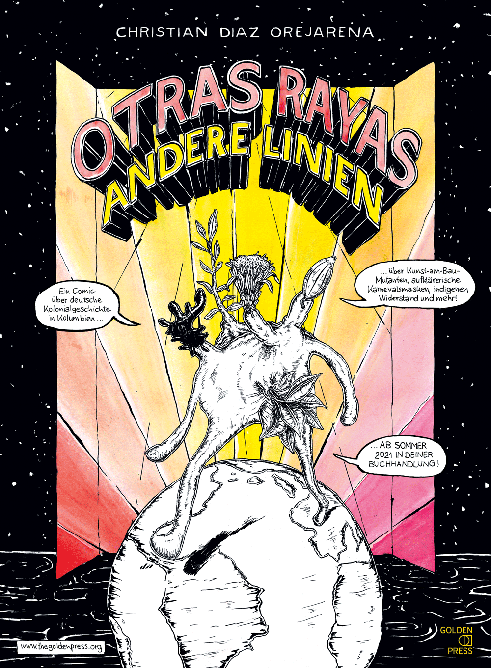 ESPAÑOL: Un cómic que trata de la historia colonial alemana en Colombia.Como parte de una beca, Christian Díaz Orejarena recorre los llamados "Caminos de Lengerke" en el noreste de Colombia, que fueron trazados por un empresario alemán en el siglo XIX. Allí encuentra historias heroicas sobre comerciantes sin escrúpulos, mitos e historias sobre la explotación y la megalomanía y mecanismos económicos que continúan hasta hoy. Por caminos, senderos y pensamientos sinuosos, seguimos la historia familiar del autor, conocemos máscaras de carnaval iluminadas, a la escultura en el espacio publico "Walking Man" de Múnich que ha cobrado vida y a la historia de resistencia de indígenas. En Otras Rayas - Andere Linien, Christian Díaz Orejarena aborda un tema de forma experimental, divertida y descabellada que todavía no ha recibido mucha atención en el mundo germanohablante, a pesar de que aquí hubo conexiones muy estrechas no sólo entre Colombia y los comerciantes de las ciudades hanseáticas alemanas.